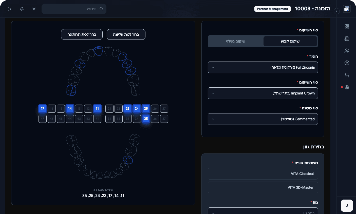 תהליך הזמנה אינטואיטיבי המנחה אתכם צעד-אחר-צעד. בחרו שיניים, חומרים וגוונים בממשק גרפי נוח, ומנעו טעויות הזנה נפוצות.